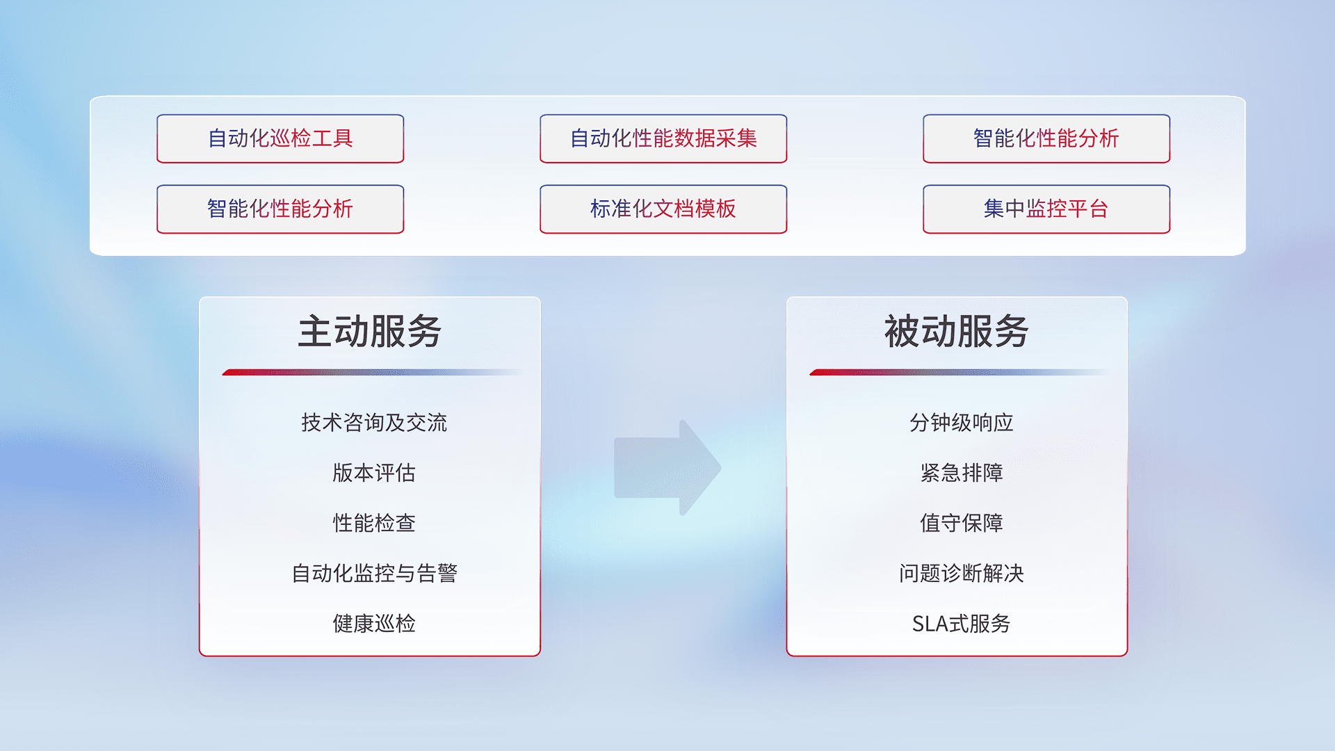智能化工具和标准化文档,,,,保障服务质量,,,提供主动服务(包含技术咨询、、、、版本评估、、、、性能检查、、自动化监控与告警、、、、健康巡检)和被动服务包含(分钟级响应、、、紧急排障、、、、值守保障、、问题诊断解决、、、、SLA服务)。。。。